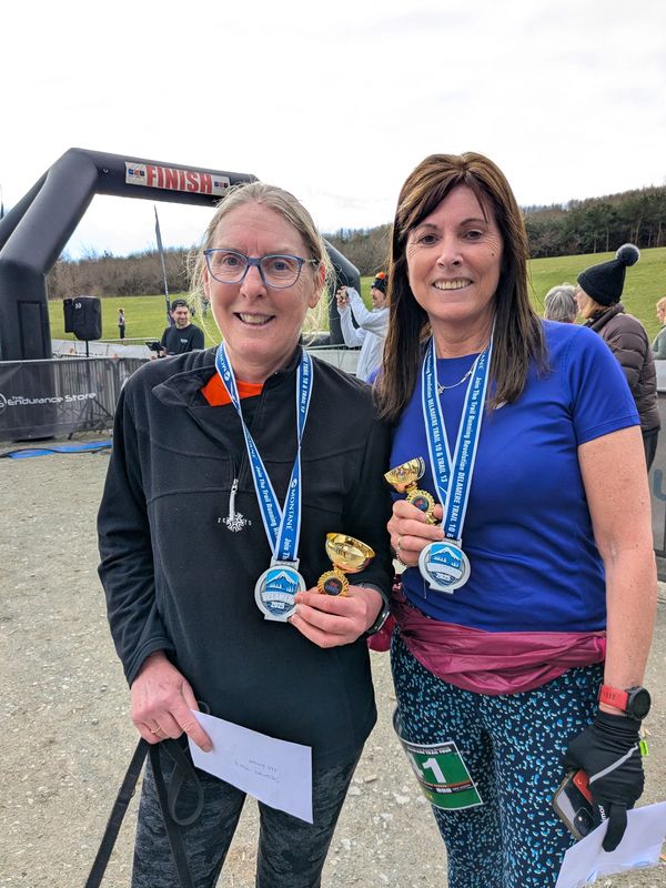 2 Age group winners at Delamere March 2025. Sue 1st V60 in the Half, Liz 1st V60 in the 10km